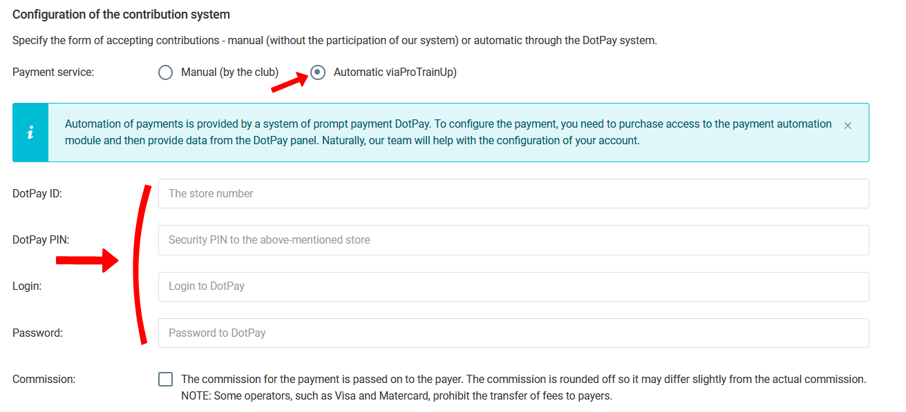 გადახდის სისტემაში აღრიცხვის მესამე ვარიანტია ProTrainUp სისტემაში პირდაპირ შენატანების გადახდის შესაძლებლობის გააქტიურება. ეს ვარიანტი შემდეგ ხელმისაწვდომია როგორც მობილური აპლიკაციის, ისე ვებ ბრაუზერის მეშვეობით. თუმცა, ამ ვარიანტის გააქტიურებამდე, თქვენ უნდა შეასრულოთ რიგი ფორმალური მოქმედებები კლუბის სახელით DotPay ანგარიშის შესაქმნელად და ავტორიზაციისთვის.