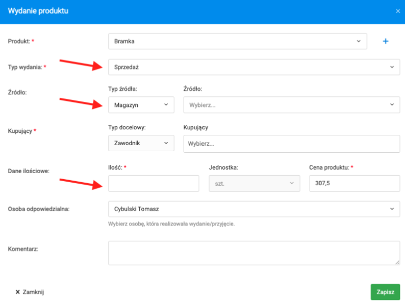 Kolejny etap to wybranie źródła, z którego nastąpi przyjęcie produktu na magazyn. Na liście wyboru masz do wybrania kilka pozycji m.in. sklep, sponsor czy inny magazyn. Następnie musisz ustalić gdzie ma trafić dodawany produkt, domyślnie jest to magazyn, w którym rozpocząłeś procedurę przyjęcia sprzętu na magazyn. Następnie uzupełnij ilość oraz cenę produktu. W kolejnym kroku wybierz osobę odpowiedzialną za przyjęcie sprzętu na magazyn. Domyślnie jest to osoba, która to przyjęcie wprowadza do systemu. Ostatni krok, to możliwość wprowadzenia komentarza. Po uzupełnieniu wszystkich obowiązkowych pól, pozostaje zapisanie przyjęcia. Aby to zrobić kliknij w zielony przycisk „zapisz” w prawym dolnym rogu okna.